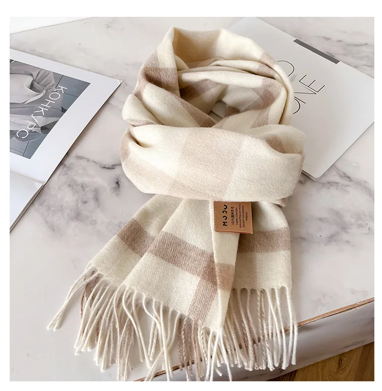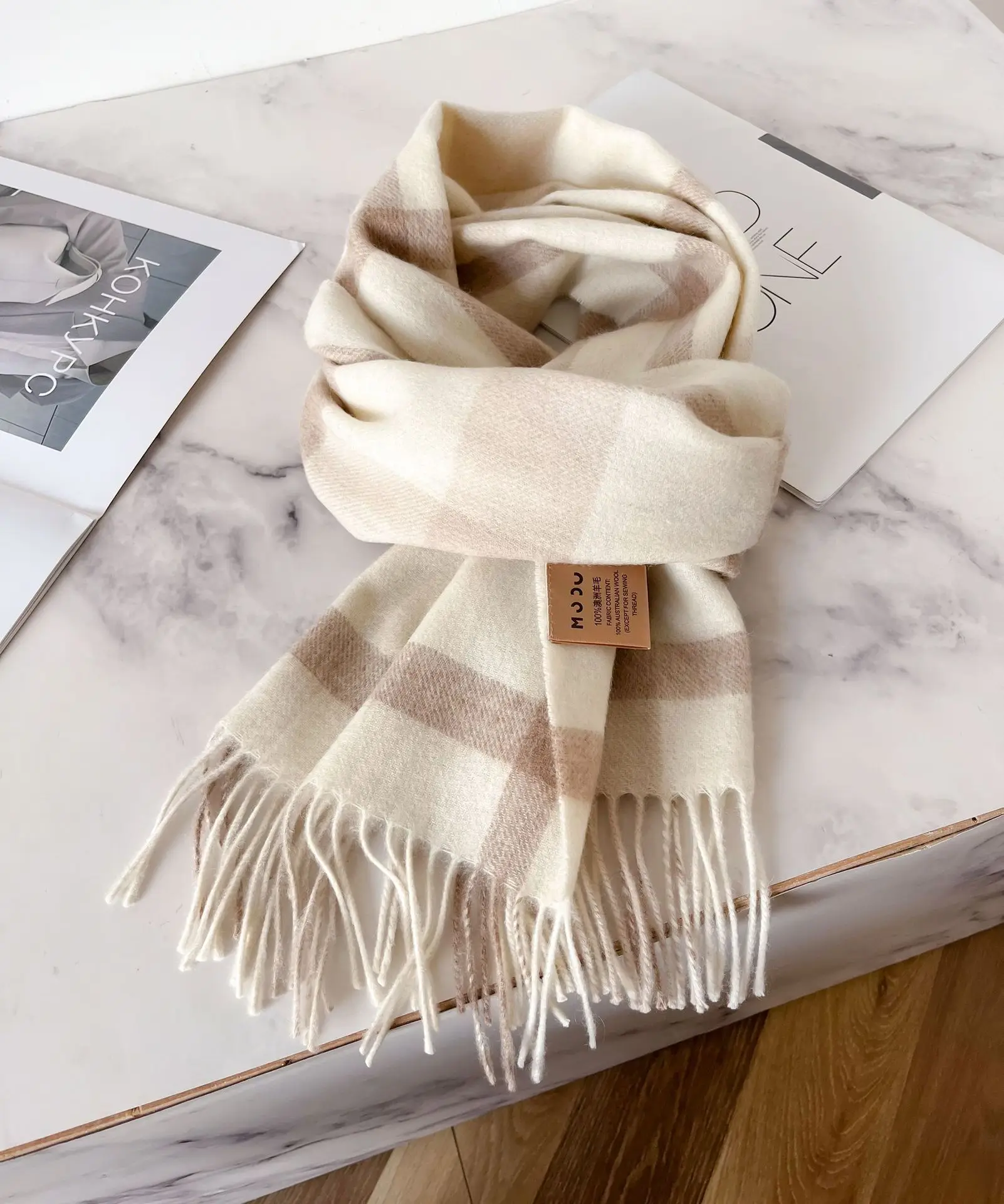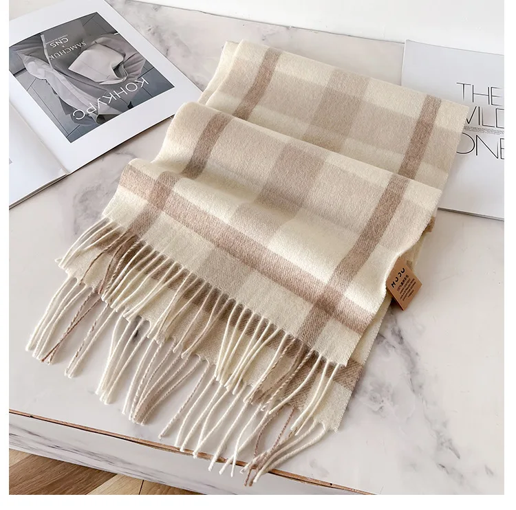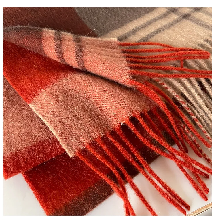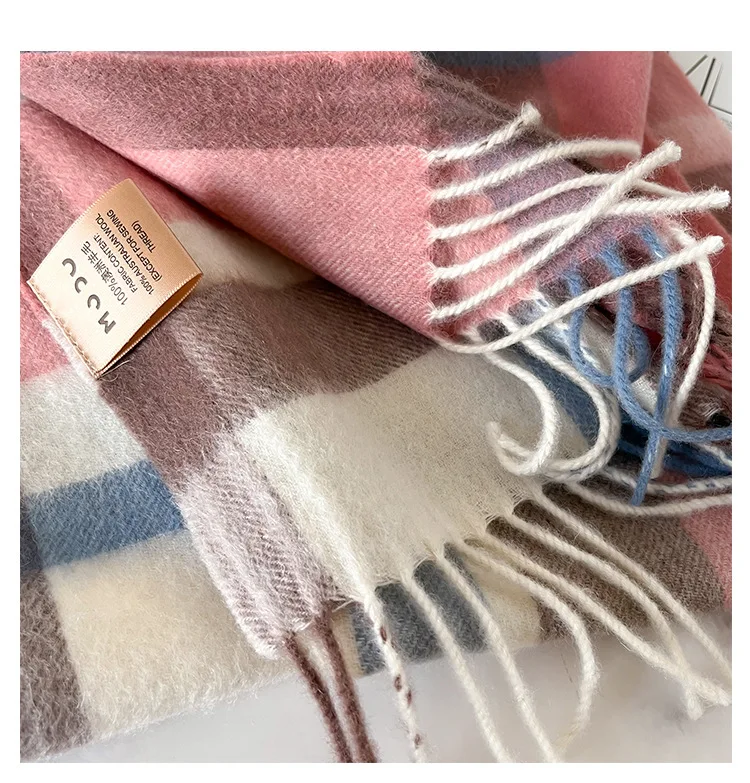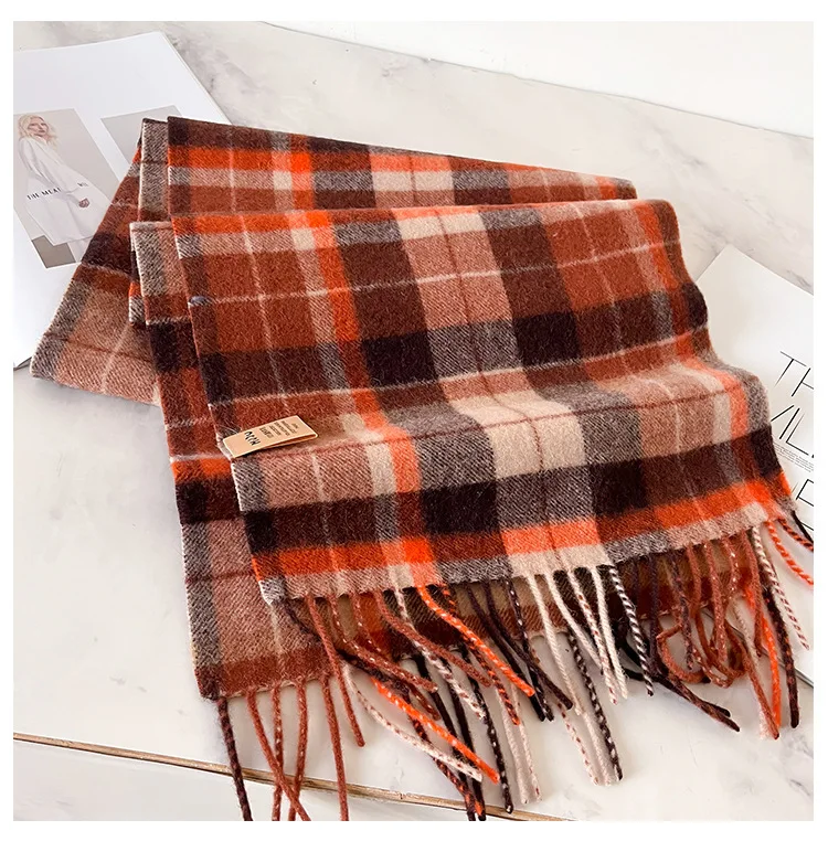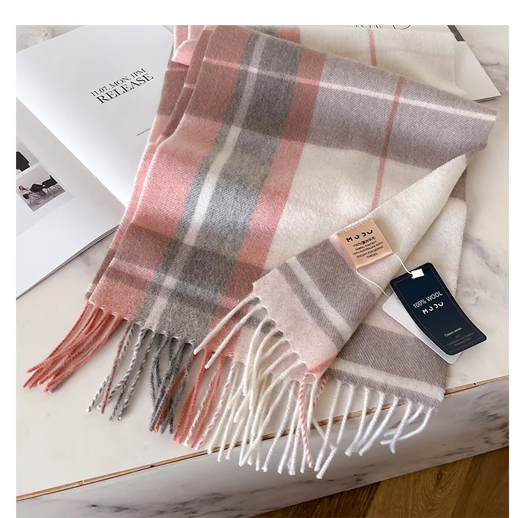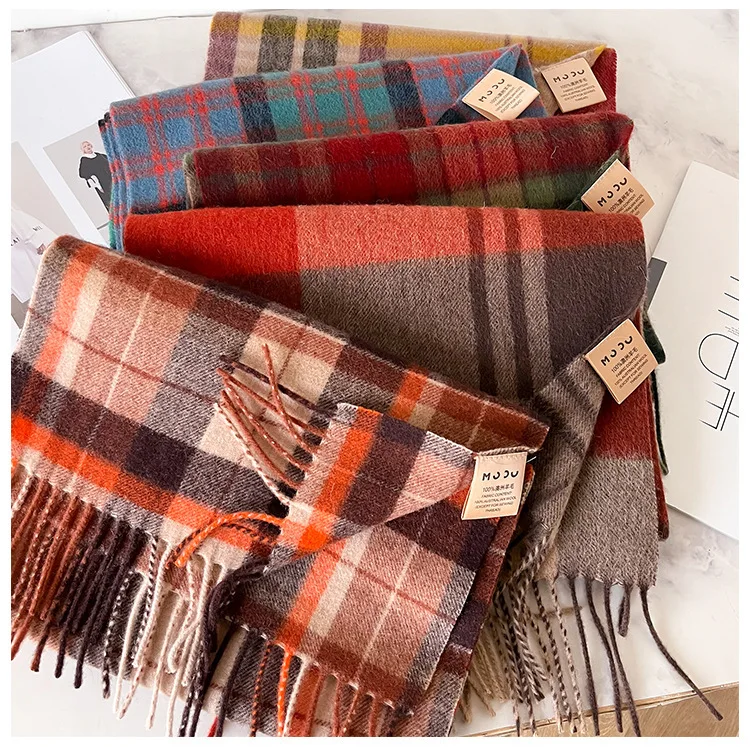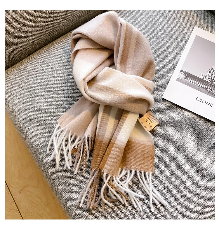 Women’s 100% Wool Plaid Scarf – Luxury England-Style Striped Shawl with Tassels, Pashmina Wrap