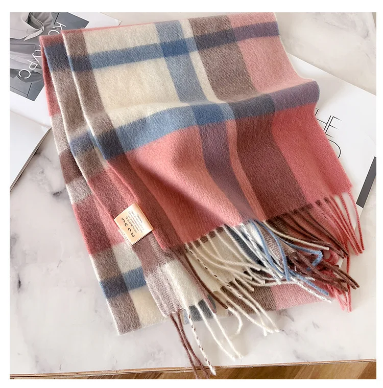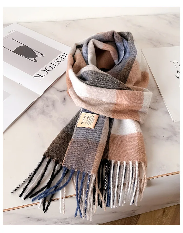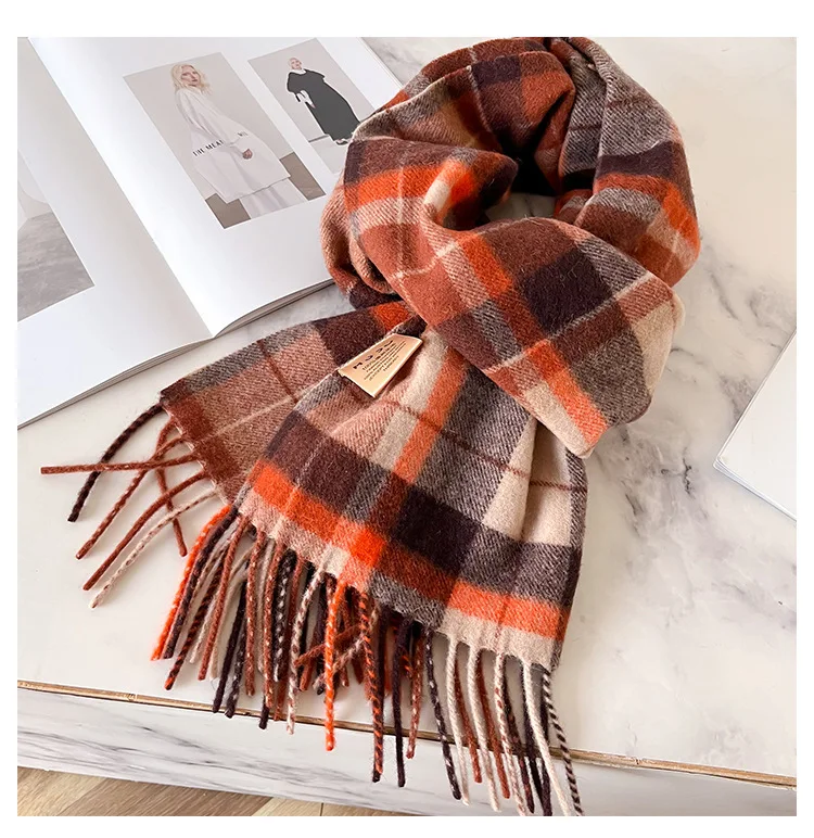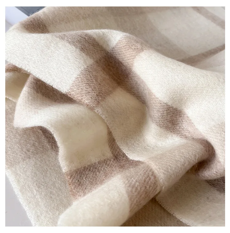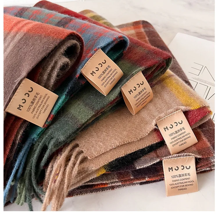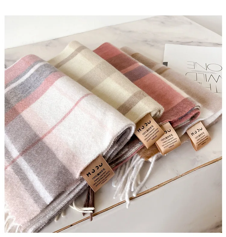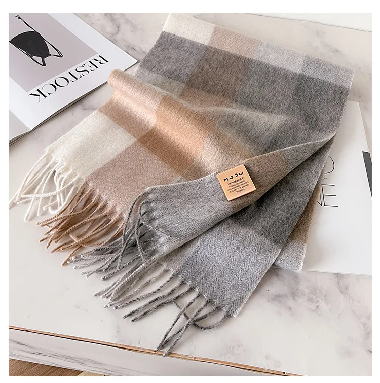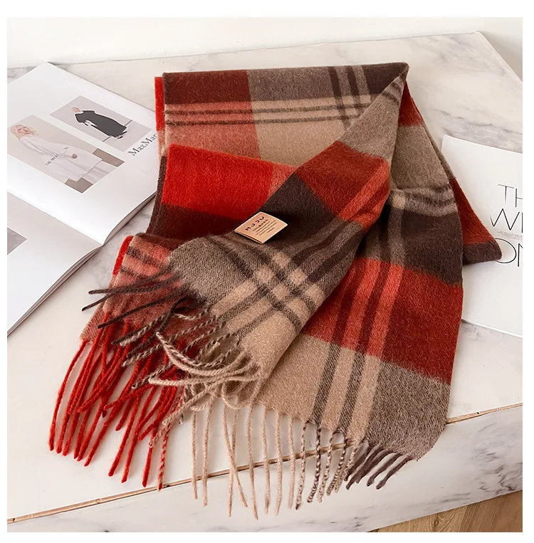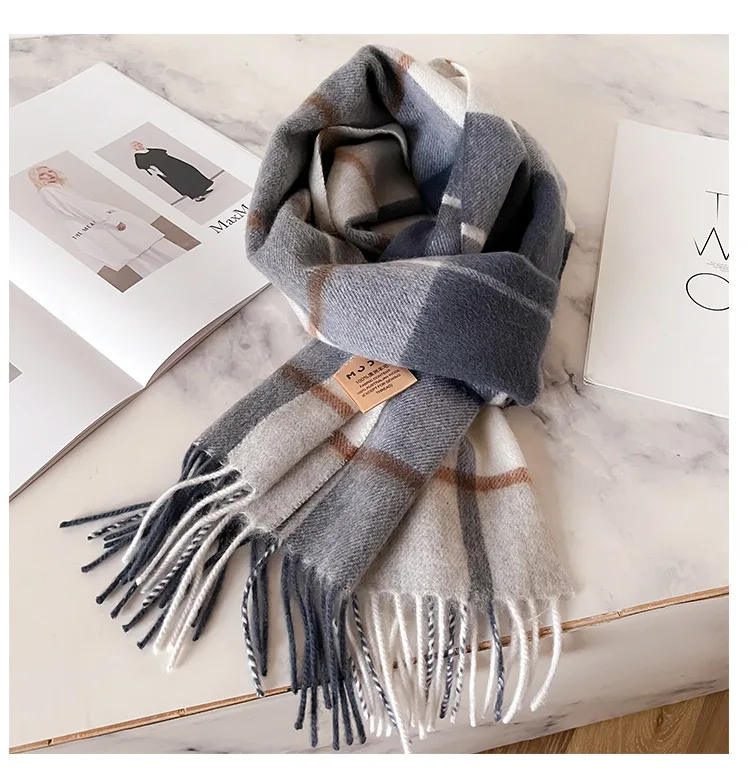 Women’s 100% Wool Plaid Scarf – Luxury England-Style Striped Shawl with Tassels, Pashmina Wrap