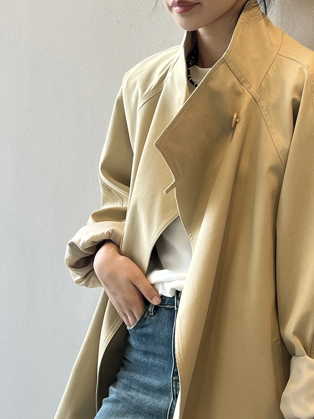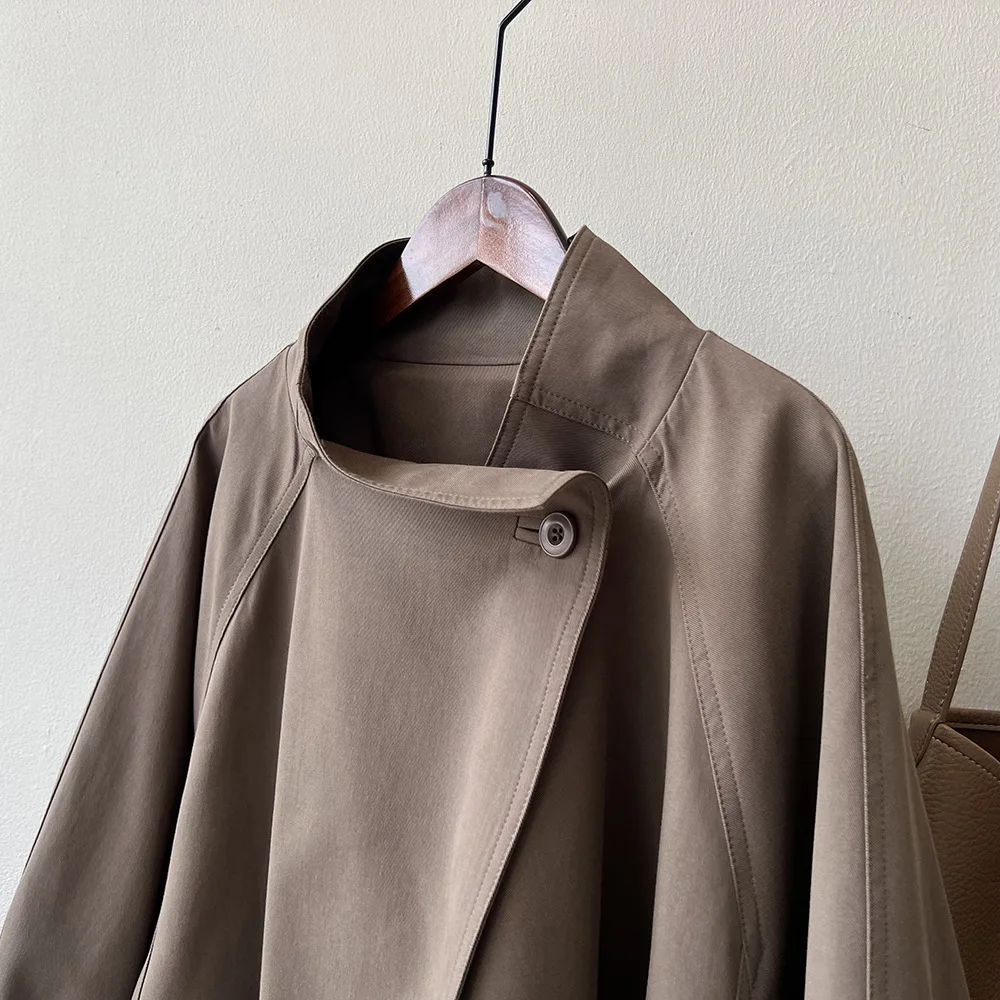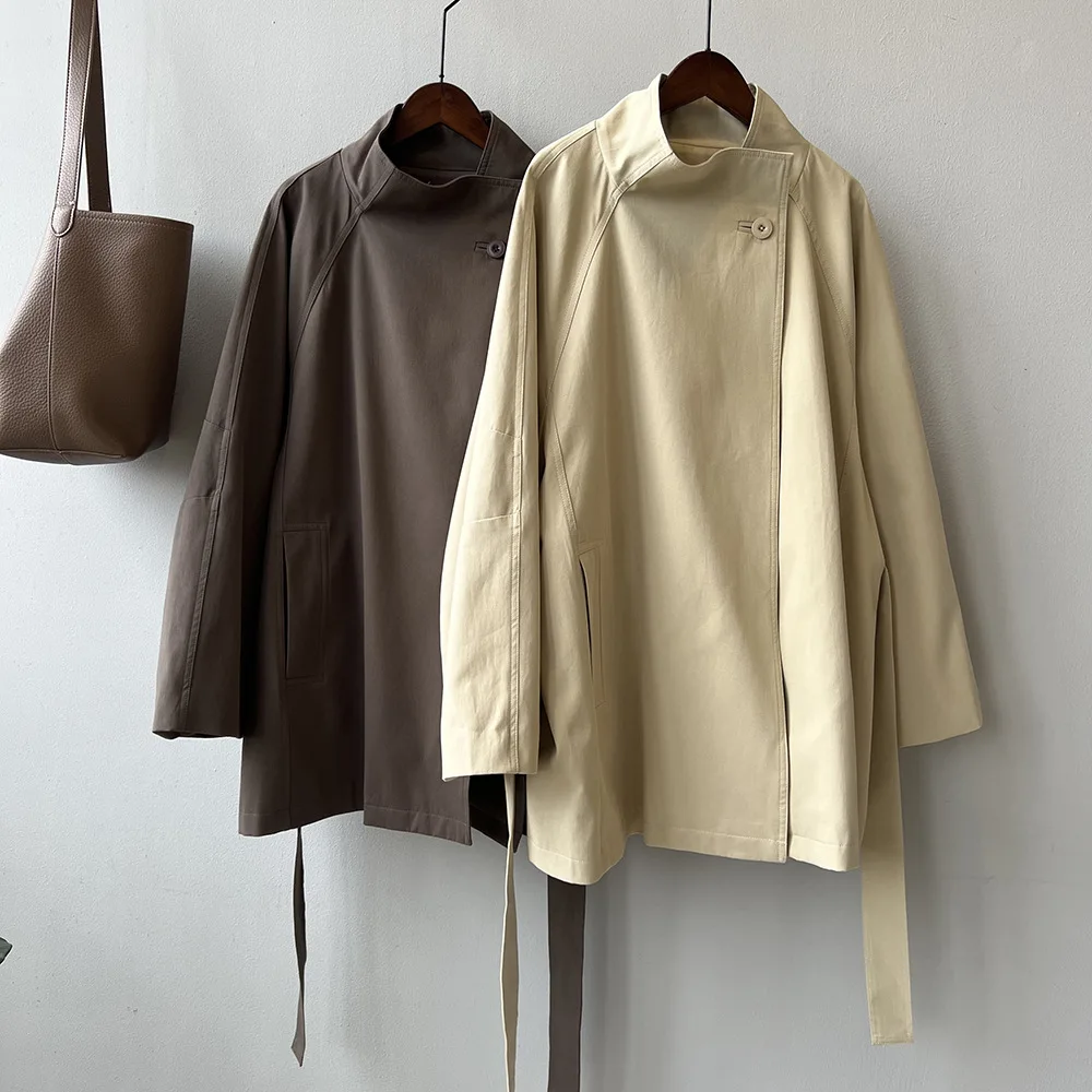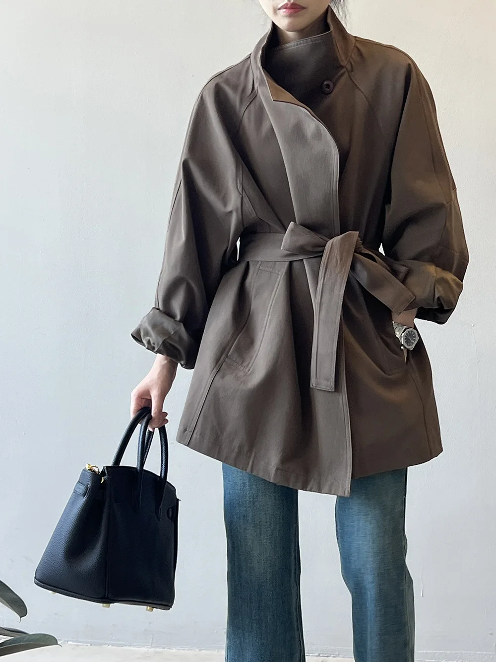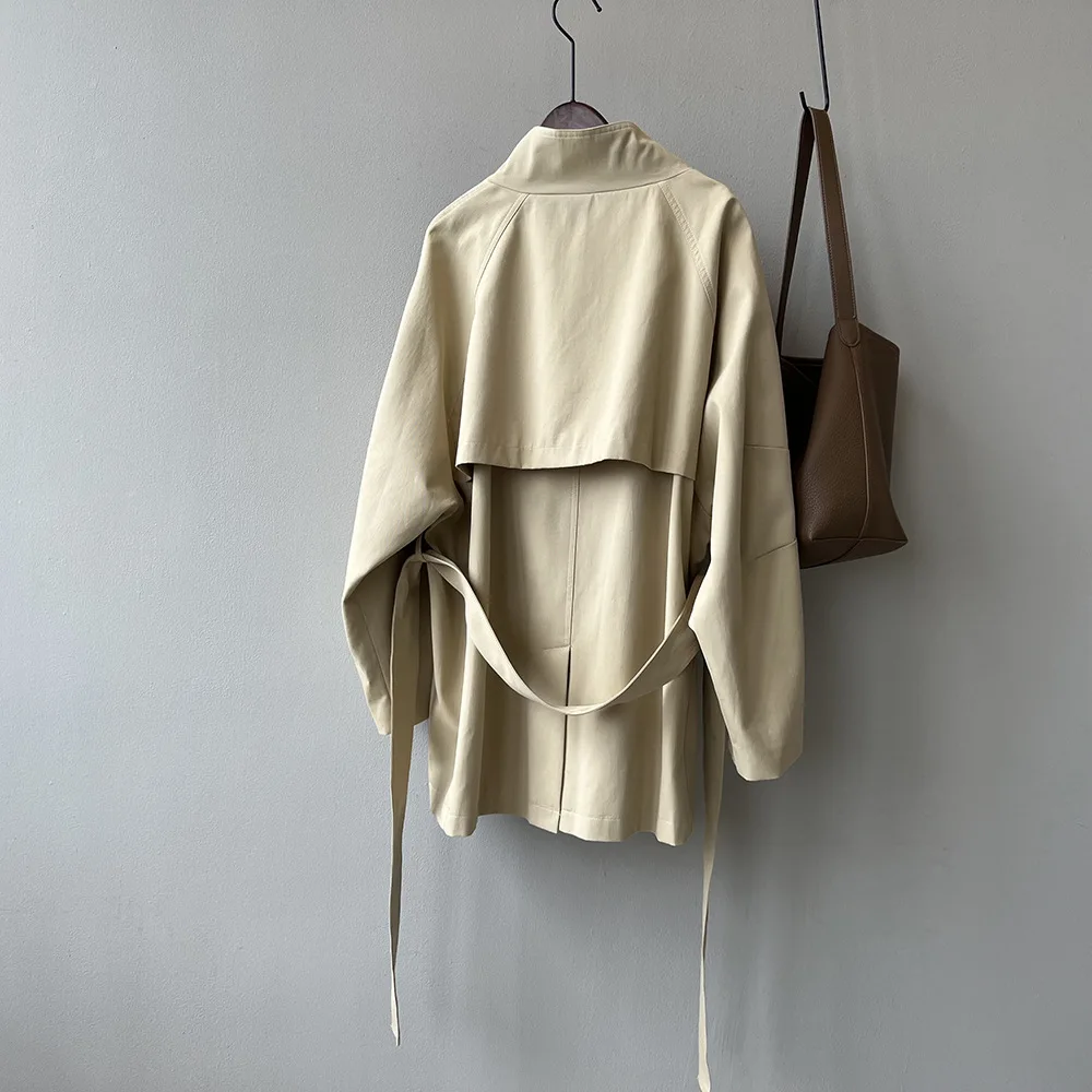 Women’s Khaki Trench Coat with Belt – Loose Stand Collar Autumn 2025 Casaco Feminino