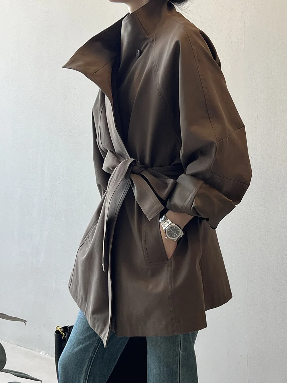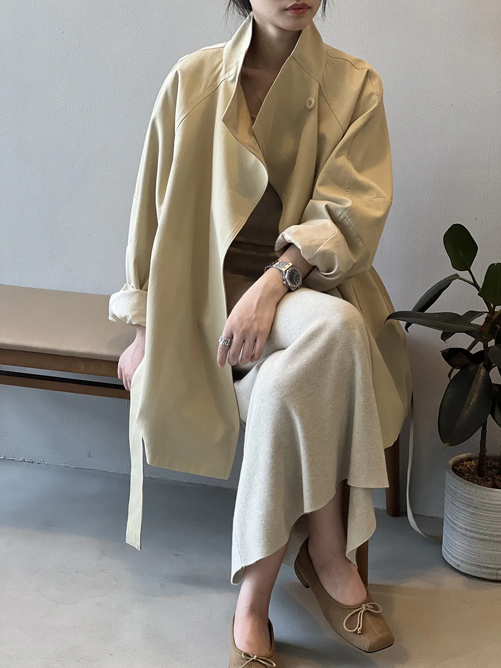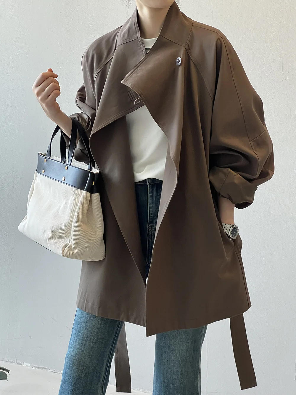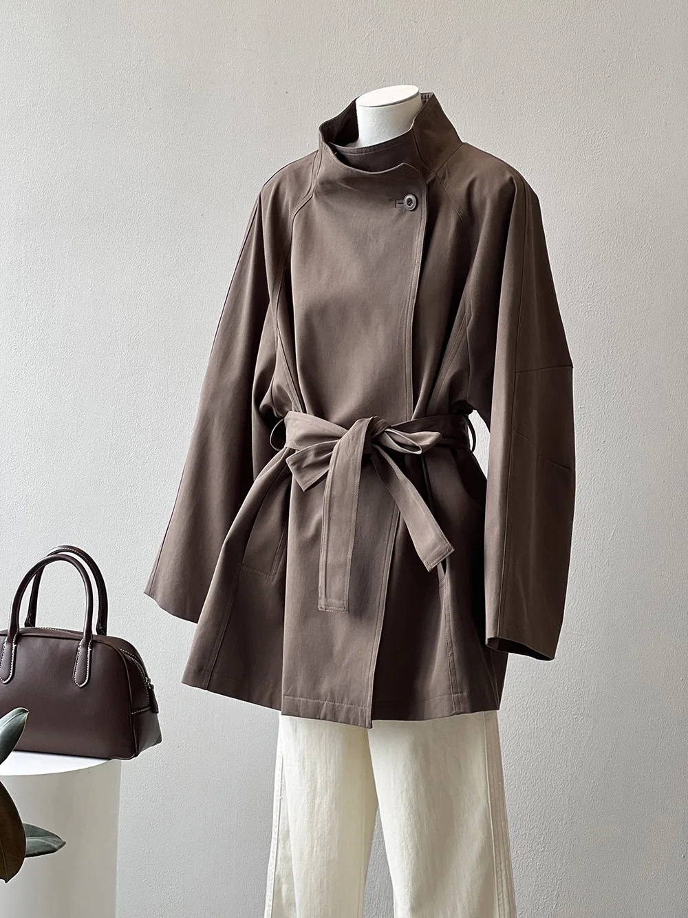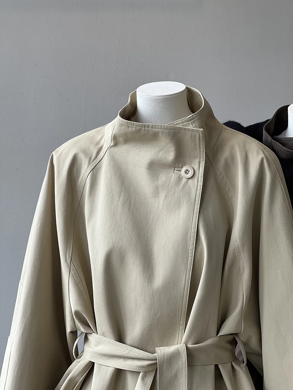 Women’s Khaki Trench Coat with Belt – Loose Stand Collar Autumn 2025 Casaco Feminino