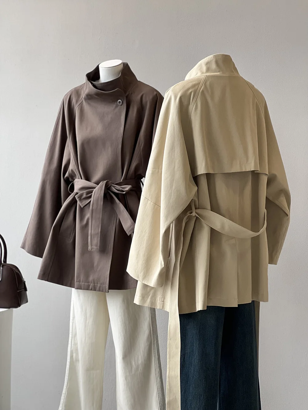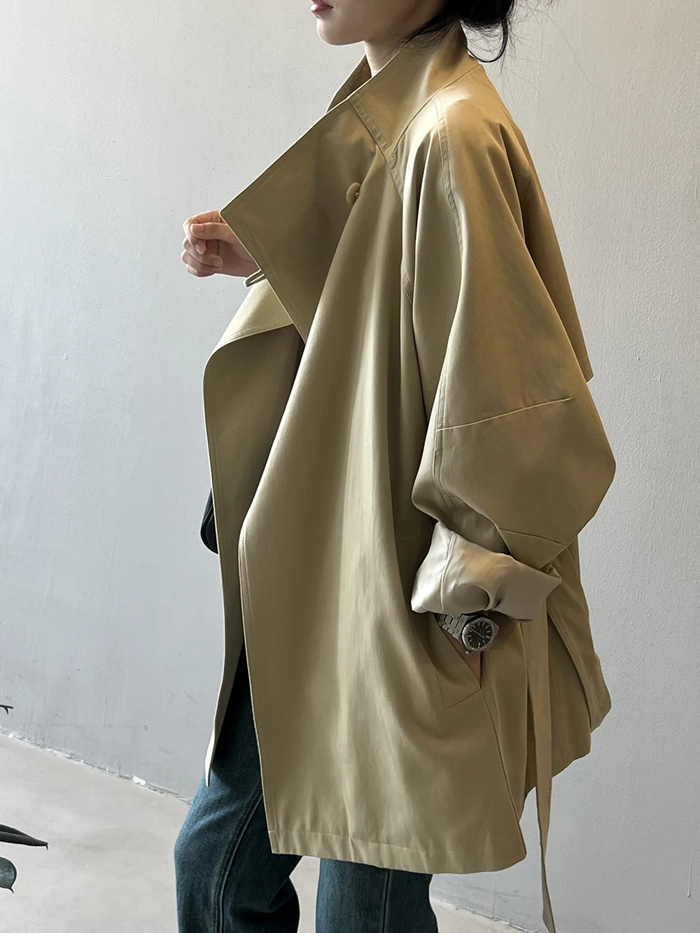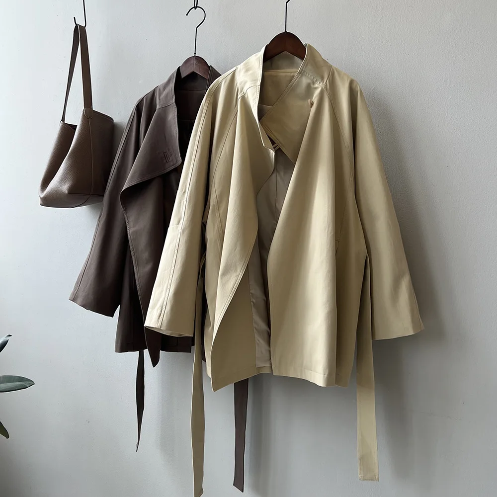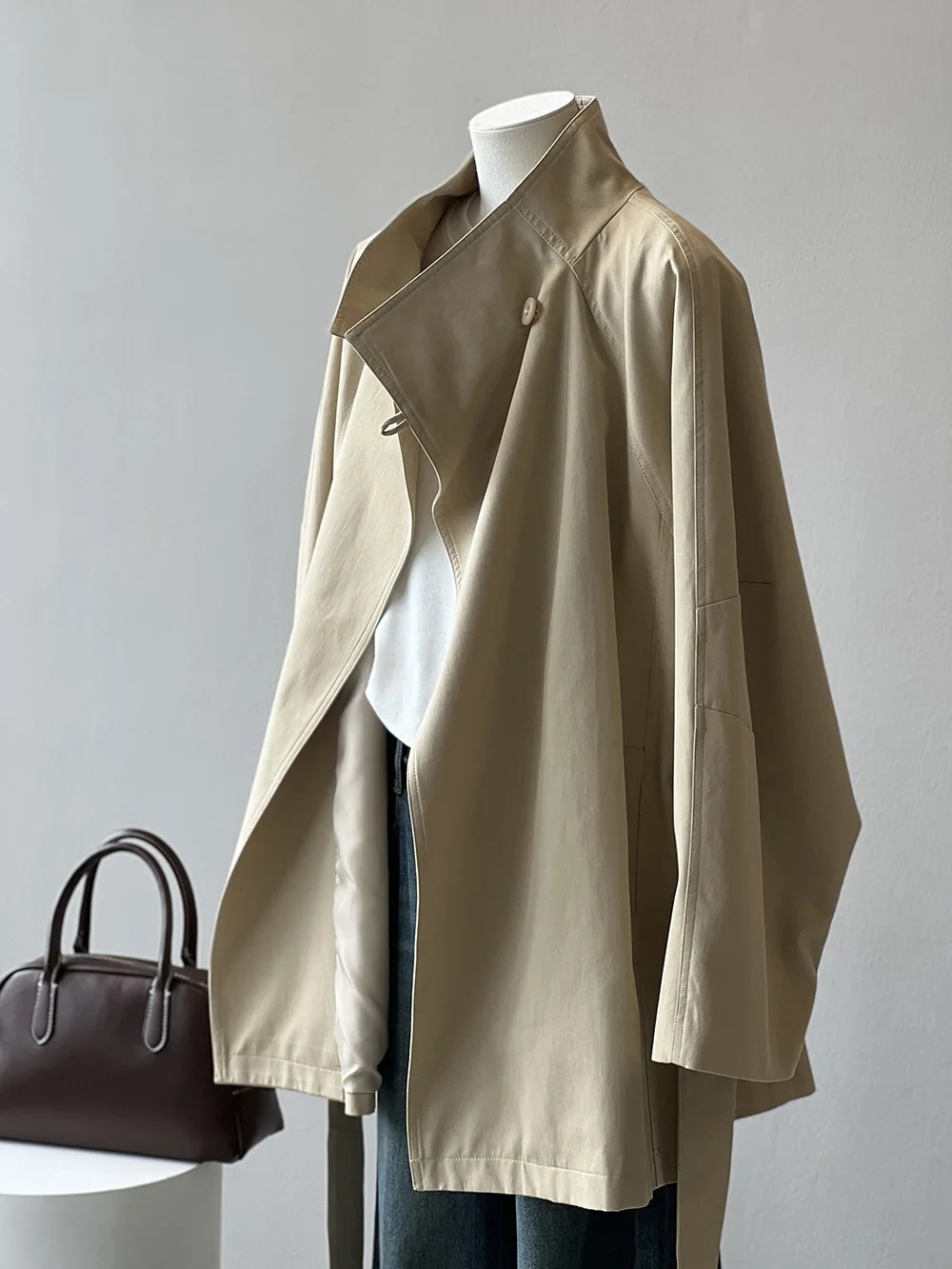 Women’s Khaki Trench Coat with Belt – Loose Stand Collar Autumn 2025 Casaco Feminino