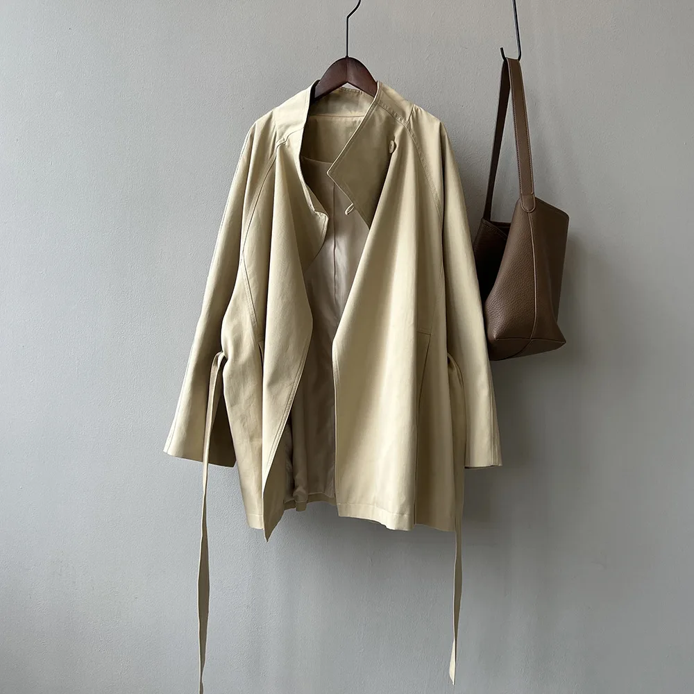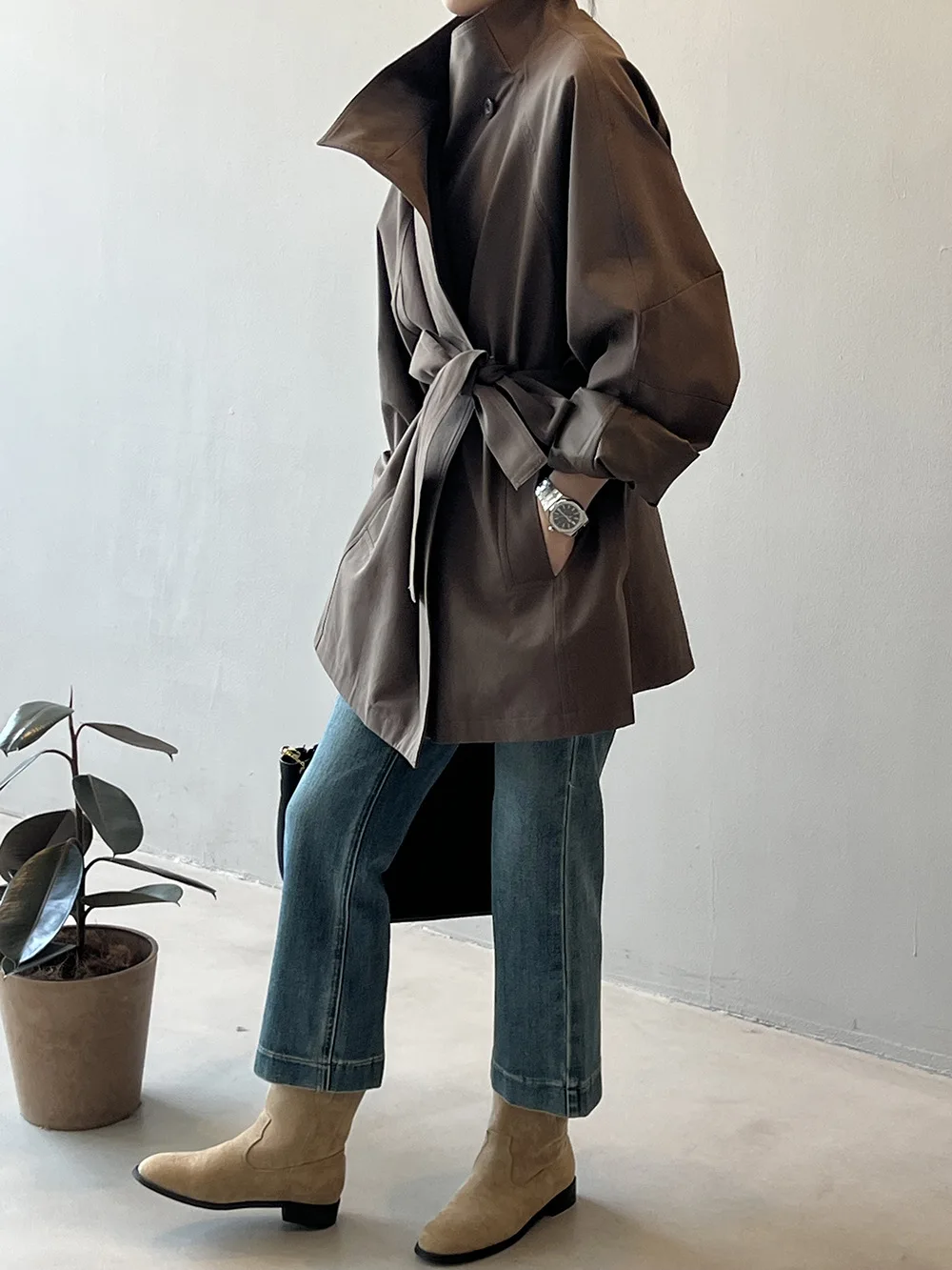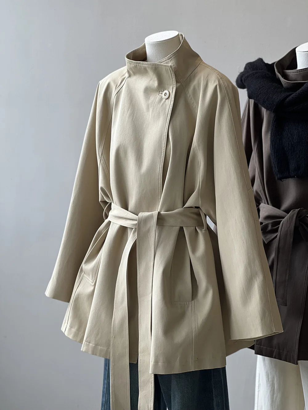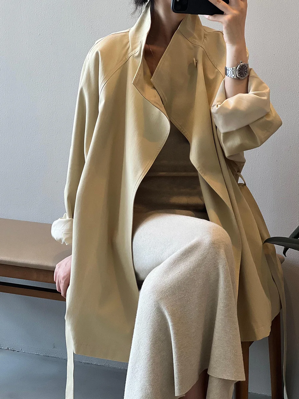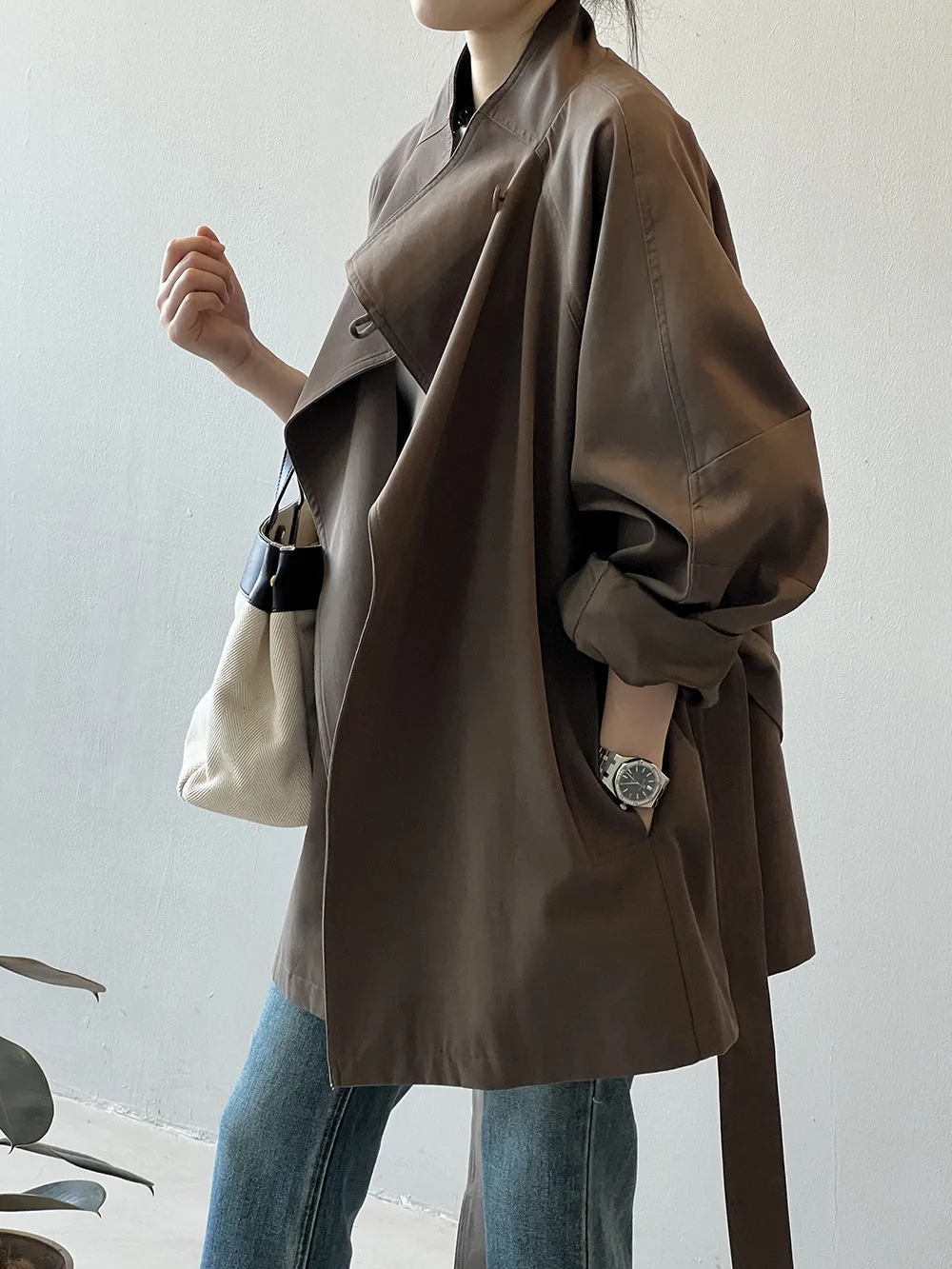 Women’s Khaki Trench Coat with Belt – Loose Stand Collar Autumn 2025 Casaco Feminino