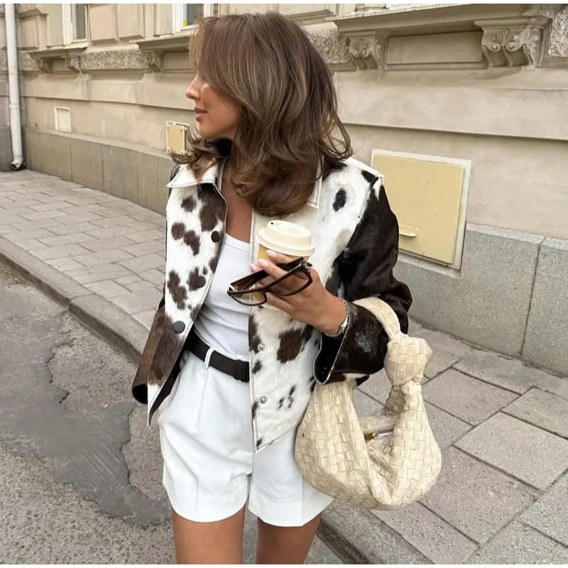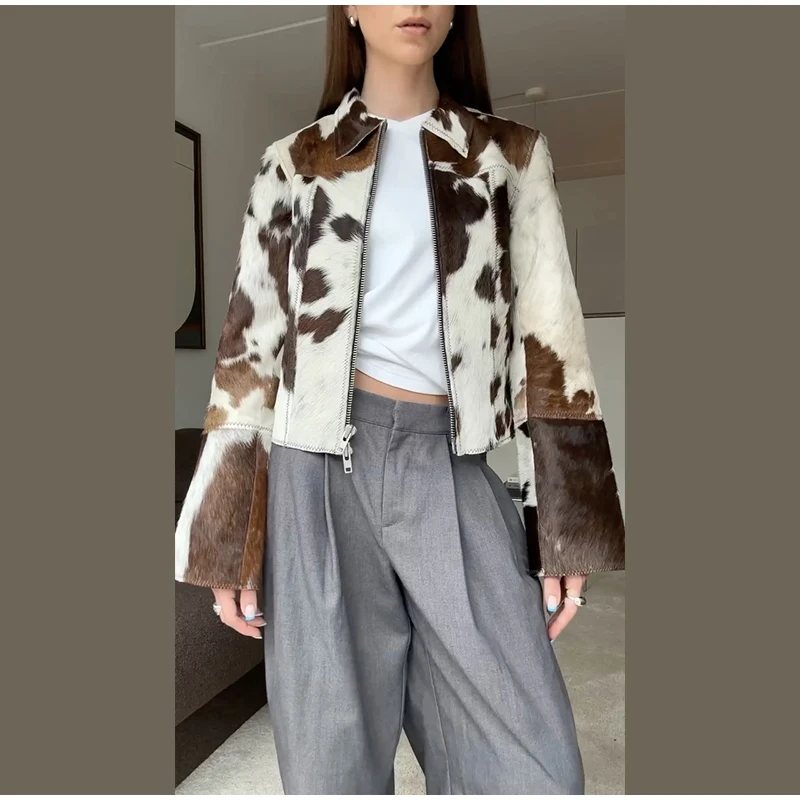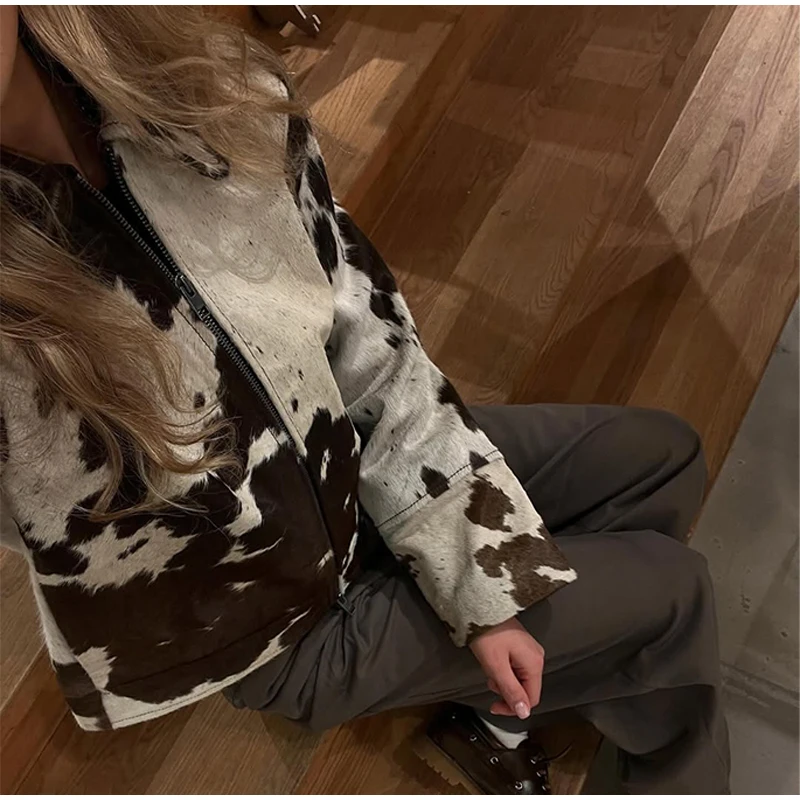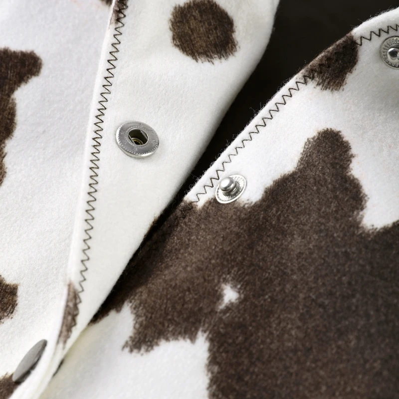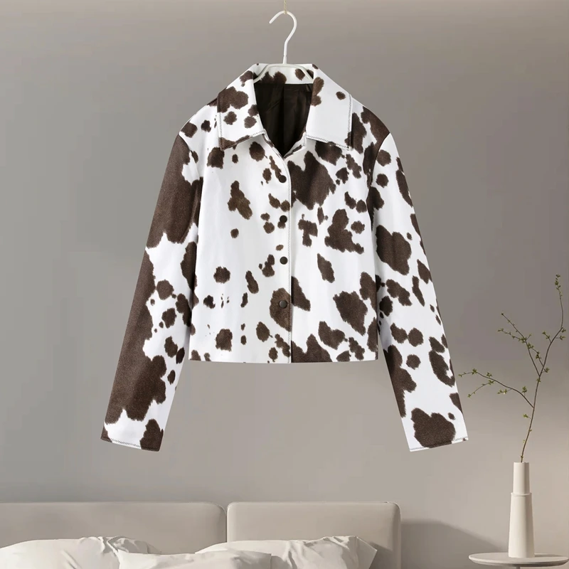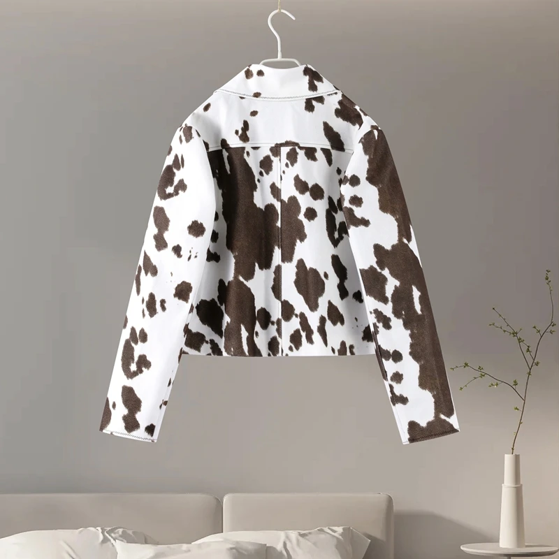Women’s Cow Print Jacket – Loose Standneck Zipper Coat for Autumn Winter 2025
