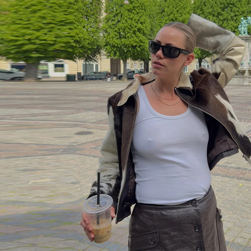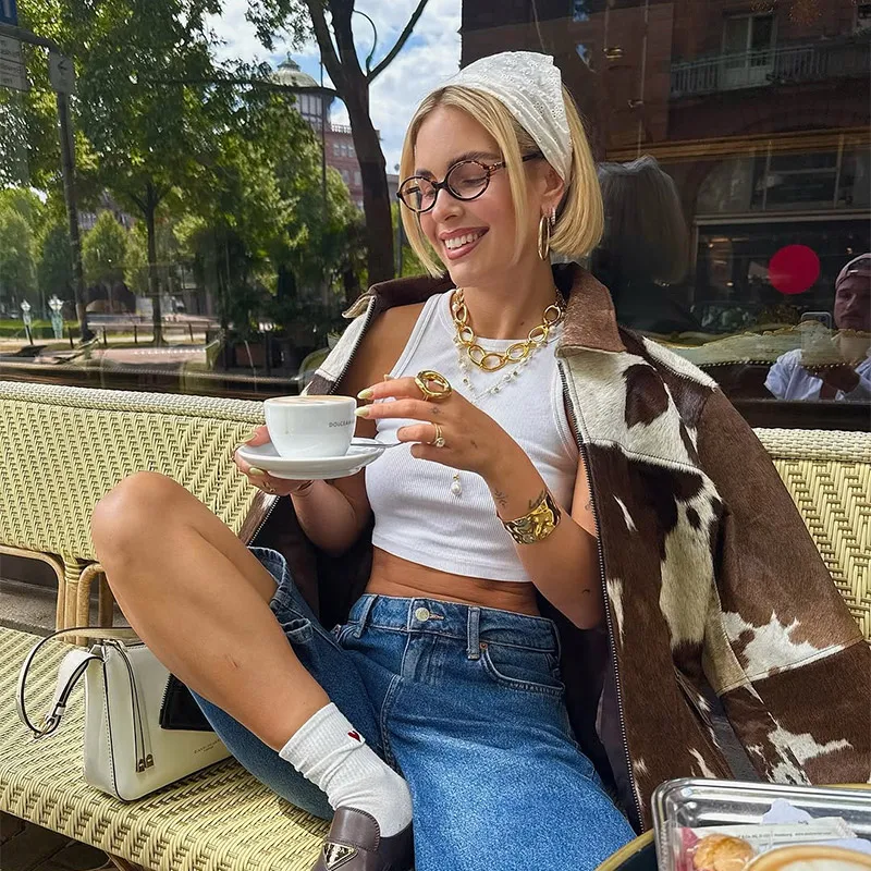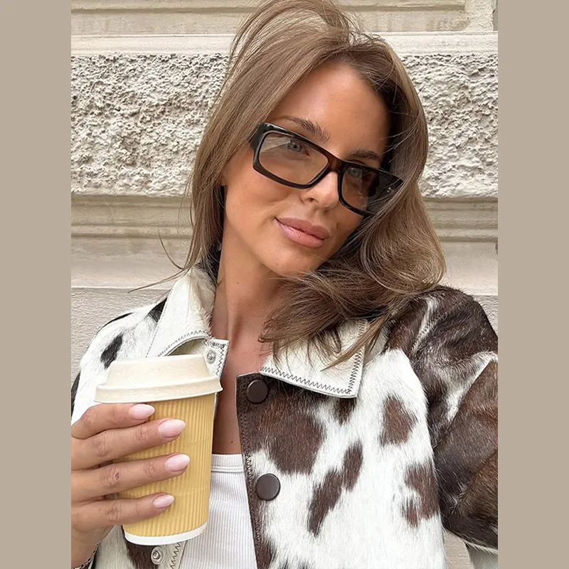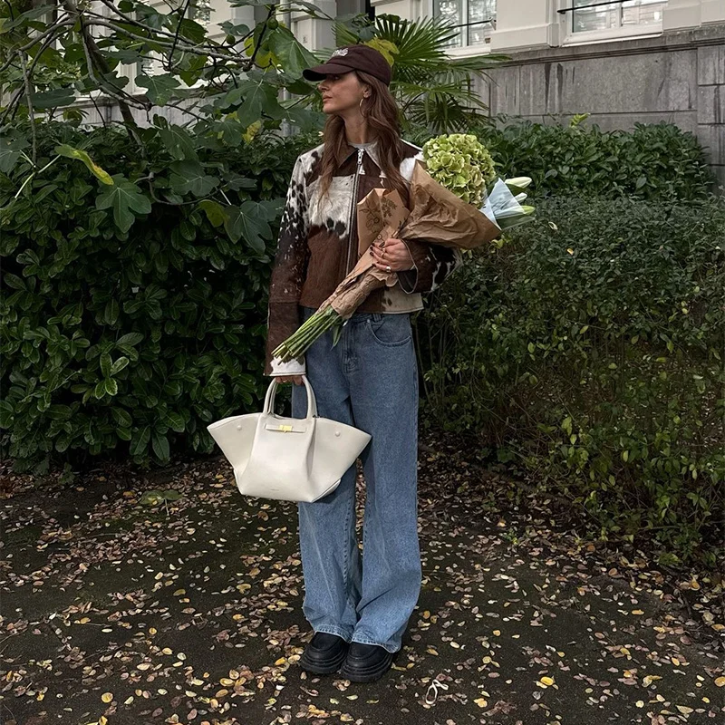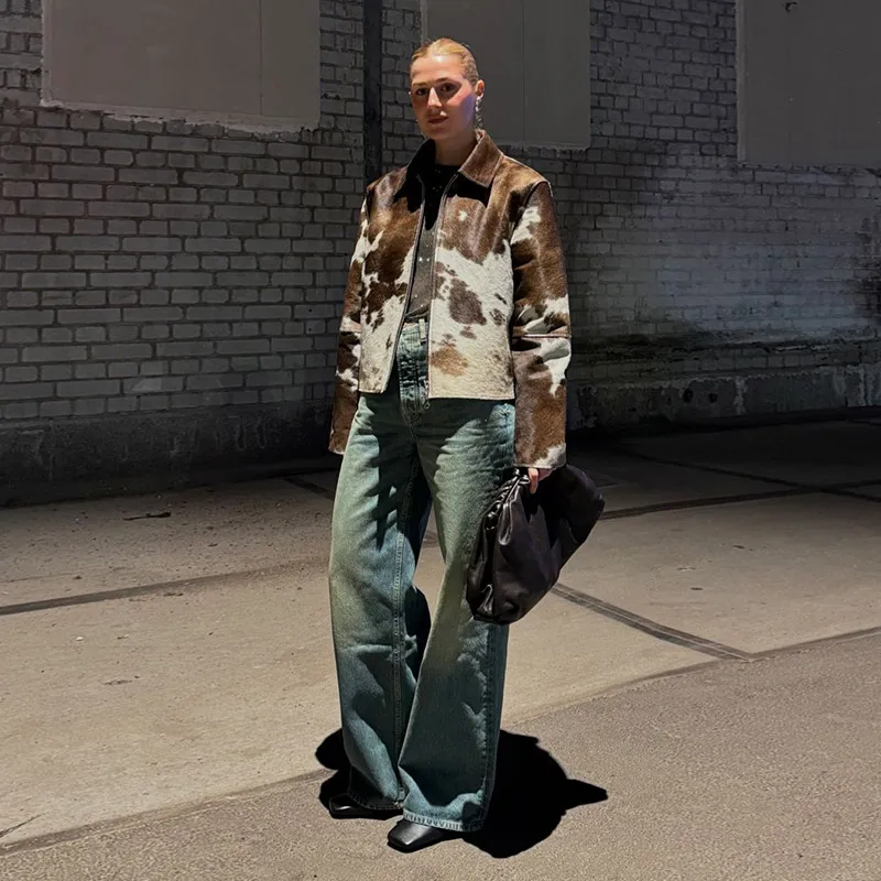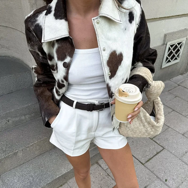 Women’s Cow Print Jacket – Loose Standneck Zipper Coat for Autumn Winter 2025